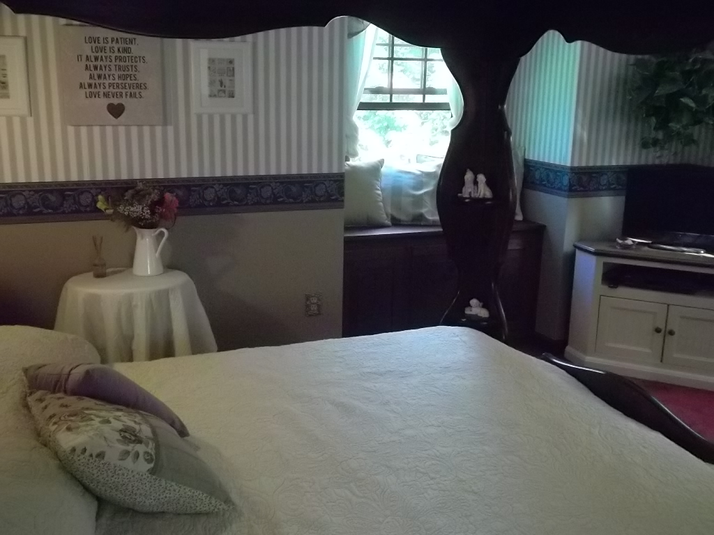This next room is a very odd bedroom in a basement level of a condo. The key to making this work was to hang the curtains to the ceiling to make the window look taller and center the bed under the window, even though it was not in the center of the wall.
